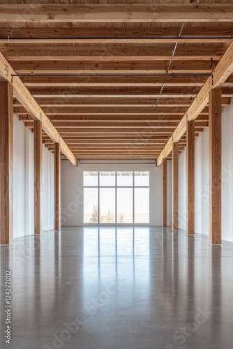 Obraz premium A wide-angle view of an empty, minimalist interior with wooden beams on the ceiling and concrete floors. The walls have white panels, creating a contrast against the natural wood elements.