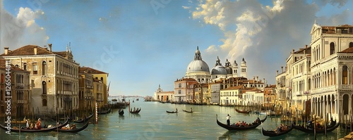 Naklejka premium A wide-angle view of the Grand Canal in Venice, with elegant palaces and bustling water traffic, showcasing the beauty of the city’s waterways
