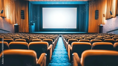 © Theeranan, Fototapeta premium A wide auditorium showing empty rows of plush seats and a blank stage screen ready for projection.