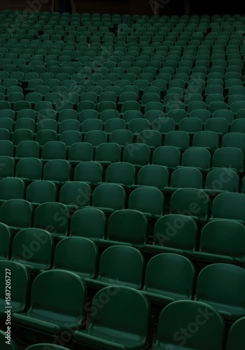 Fototapeta premium A wide, elevated view of an empty auditorium filled with countless dark green...
