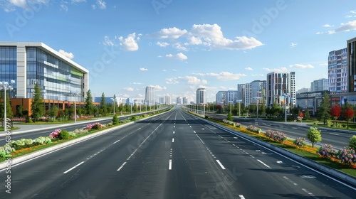 © Sundas, Fototapeta premium A wide, empty highway in a bustling city, with a line of contemporary commercial buildings on one side and a manicured greenway with seasonal flowers and trees on the other.