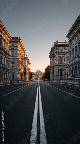 Fototapeta premium A wide empty urban road stretches through a cityscape lined with classical architecture. Grand facades, stone columns, and historic buildings frame the roadway, creating a timeless blend of urban stru