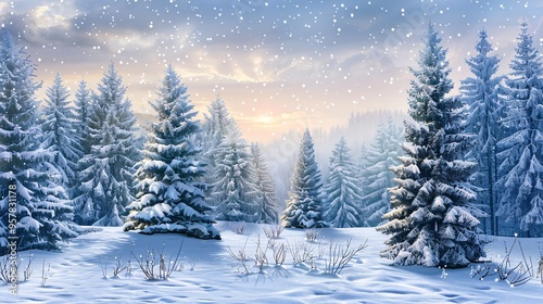 Naklejka premium 07240954 390. A wide-format Christmas background illustration of a serene snowy forest, the photorealistic details of the snow-covered Christmas trees and the peaceful winter landscape creating a