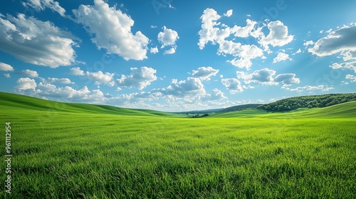 Fototapeta premium A wide, green field stretches under a bright blue sky with fluffy white...
