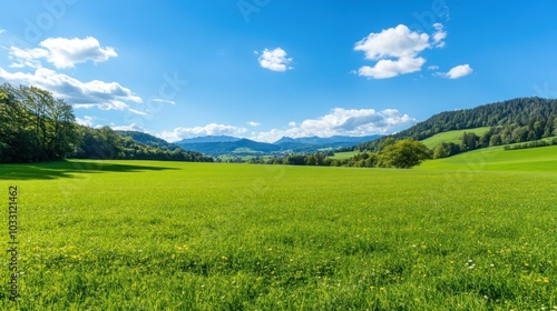 Fototapeta premium A wide, green meadow with rolling hills in the background, under a clear blue sky with fluffy white clouds.