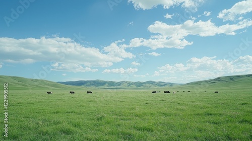Obraz premium A wide green pasture with rolling hills, dotted with grazing cows under a...