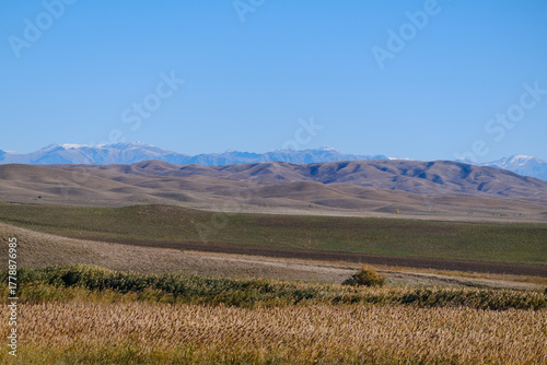 © Microscope, Obraz premium A wide-open countryside scene with gentle brown hills, patchwork fields and distant snow-capped peaks under a bright blue sky.