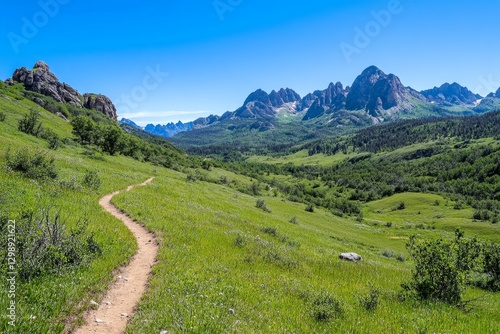 © Thanyarat, Naklejka premium A wide, open field with a single trail leading up a gently curving hill under a clear sky