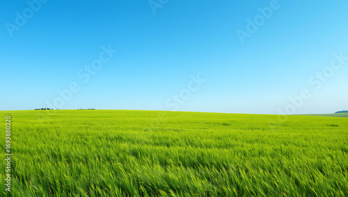 Naklejka premium A wide open landscape featuring a vibrant green meadow under a clear blue sky. Fresh grass fields bathed in bright natural light create a clean and minimal background, ideal for website design, presen