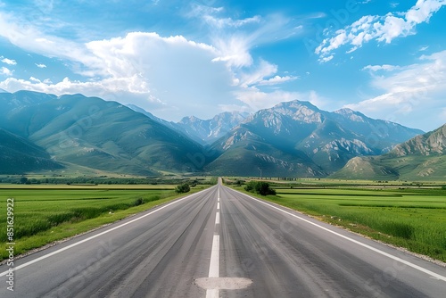 Naklejka premium A wide road leads into the distance, with green fields on both sides and snow-capped mountains in the background. The blue sky is clear, and white clouds float across it