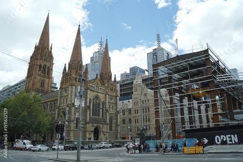 © onlyAW, Naklejka premium A wide shot captures a historic cathedral with two prominent spires standing beside a modern building under construction, with a city skyline visible in the background under a cloudy sky. Cars and ped