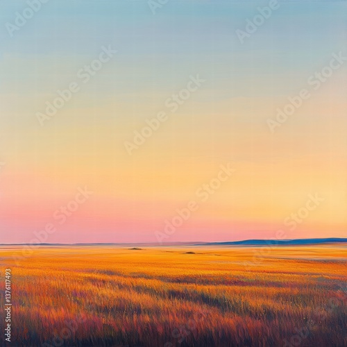 © Natthapong, Obraz premium A wide shot of a large field at sunset, where the warm orange light casts long, realistic shadows on the tall grasses, and the clear sky above is bathed in pastel hues of pink, orange, and purple