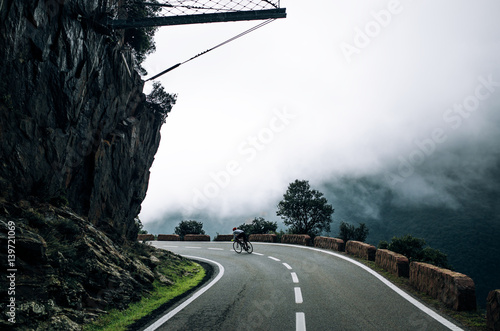 Fototapeta premium A wide shot of a male cyclist riding a dark and gloomy mountain road