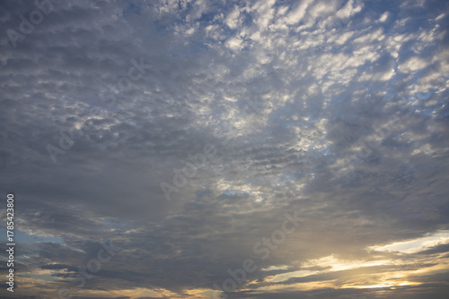 Fototapeta premium A wide shot of a sky filled with patterned altocumulus clouds, tinged