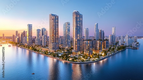 © Alief Shop, Fototapeta premium A wide shot of a waterfront development project, showcasing residential buildings, parks, and public spaces being constructed
