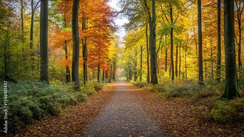 © wicha, Obraz premium A wide shot of a wooded area in fall, with trees displaying a mix of green, yellow, orange, and red leaves, creating a stunning autumn landscape