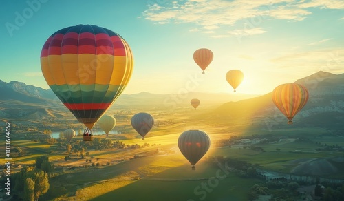 © Oleksii Halutva, Naklejka premium A wide shot of an array of colorful hot air balloons rising into the sky at sunrise, with mountains in the background.