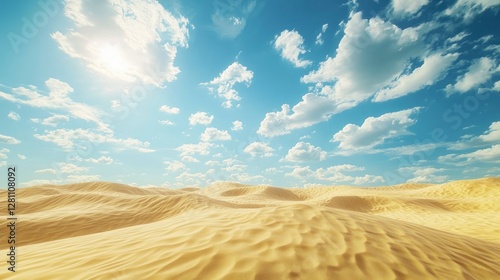 © Voilla, Naklejka premium A wide shot of desert dunes with a blue sky and white clouds