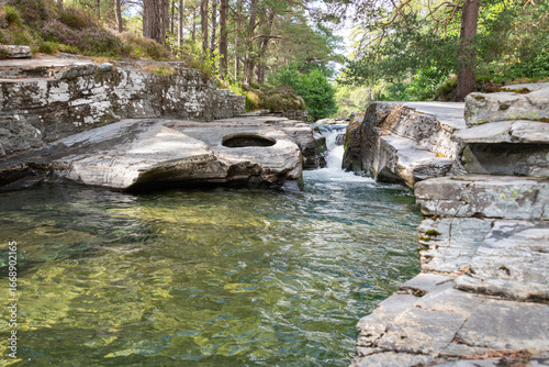 Naklejka premium A wide shot with long-exposure photo of the Linn of Quoich waterfall under Scots Pine trees.