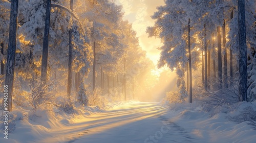 Naklejka premium A wide, snow-lined road through a winter forest, where the sun golden rays filter through tall, snow-covered trees, illuminating the untouched snow below