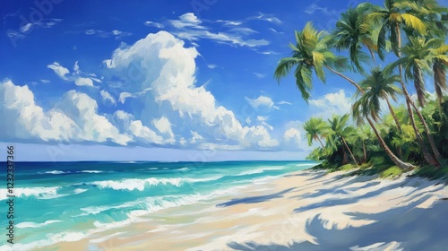 © samrit, Obraz premium A wide tropical beach scene with clear turquoise water, soft white sand, and vibrant palm trees under a bright blue sky