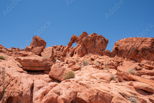 © Peregrine Stock, Obraz premium A wide view of Elephant Rock, a unique red rock formation on the side of the Valley of Fire Highway located in the Valley of Fire Sate Park in Nevada (USA), on a clear blue sky.