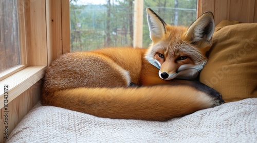 © Pricha.RT, Obraz premium A wild animal sprawled on a cozy bed in a Nordic-inspired room with simple decor, warm textiles, and light wooden elements.