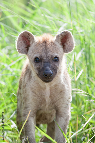 Obraz premium A wild baby Spotted Hyena standing next to its den