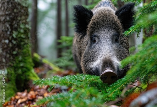 © Kien, Obraz premium a wild boar in the forest, eating leaves