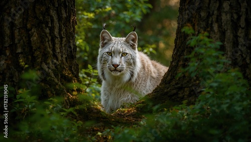 © The 2R Artificiality, Naklejka premium A wild cat peers fiercely from its hiding spot