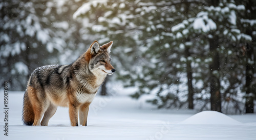 © Aura, Obraz premium A wild coyote standing in a snowy forest during winter with thick fur