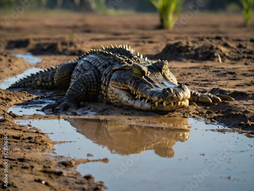 © dapra01, Obraz premium a wild crocodile crawling through muddy terrain