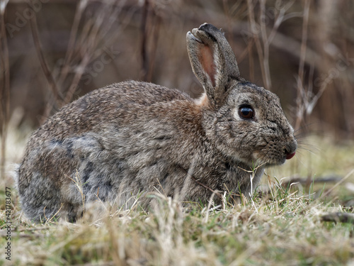 Fototapeta premium A wild European rabbit (Orytolagus cuniculus) grazing on grass