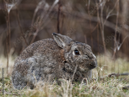 Fototapeta premium A wild European rabbit (Orytolagus cuniculus) grazing on grass