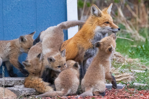 Fototapeta premium A wild female fox nurses her young fox pups in the suburbs of Colorado.