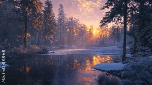 © Bilal, Fototapeta premium A wild forest lake frozen on a cold winter morning