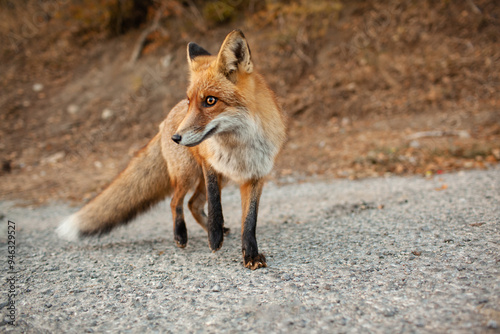 Fototapeta premium A wild fox came out on the road from the forest against the background of autumn trees