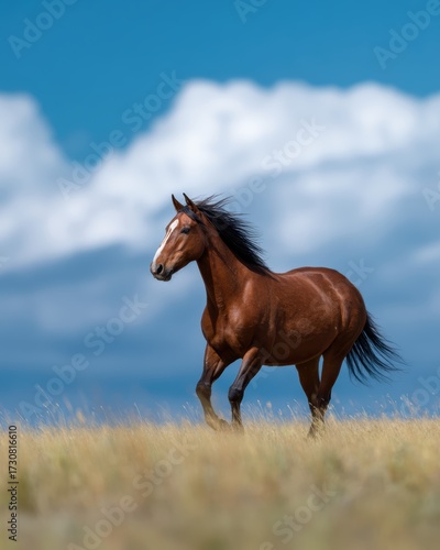 © nanskyblack, Obraz premium A wild horse running freely across an open prairie under a vast blue sky with fluffy clouds