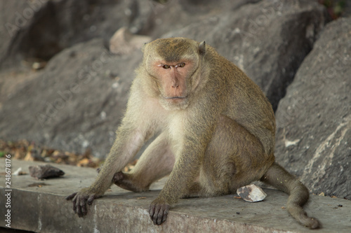 Fototapeta premium A wild macaque sits by the rock on the road in a national park.
