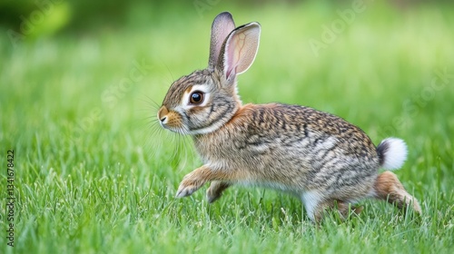 © Naufal, Fototapeta premium A wild rabbit hopping through a field of fresh green grass