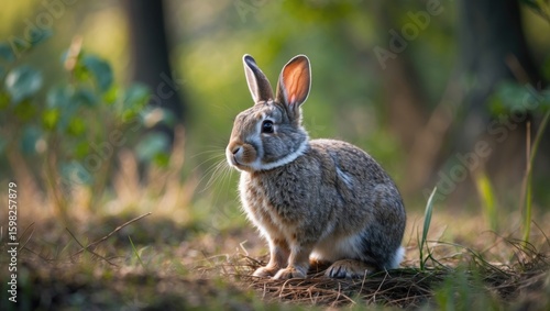 Fototapeta premium A wild rabbit in a natural outdoor setting with greenery and sunlight.