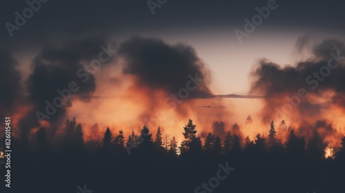 Obraz premium A wildfire in a forest at sunset with smoke clouds, depicting a dramatic...
