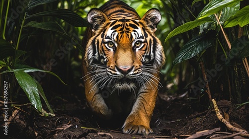 Fototapeta premium A wildlife photography shot of a tiger emerging from the dense jungle, with its eyes locked onto the camera.
