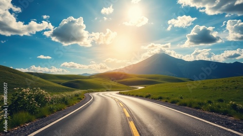 Naklejka premium A winding asphalt road leading through a picturesque landscape of rolling green hills, with a majestic mountain range in the background and a vibrant blue sky dotted with fluffy white clouds.