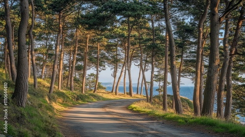 © Aisha, Fototapeta premium A winding coastal road lined with tall pine trees, with the ocean visible through the trees