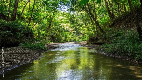 © visual artstock, Obraz premium A winding creek flows through a lush green forest, with sunlight filtering through the trees, casting dappled shadows on the water.