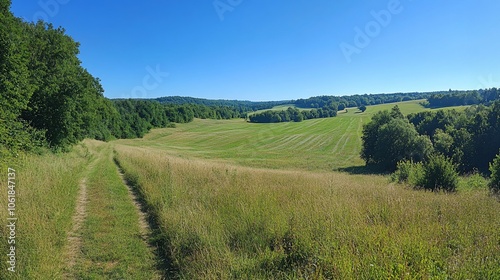 Fototapeta premium A winding dirt path leads through a lush green field towards a wooded hillside under a clear blue sky.