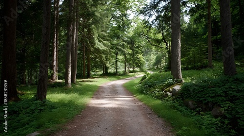 © Bussakon, Fototapeta premium A winding dirt path leads through a lush green forest bathed in d d sunlight offering a serene escape into nature