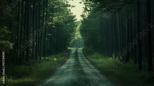 Obraz premium A winding dirt path leads through a lush green forest, sunlight filtering through the dense canopy of trees