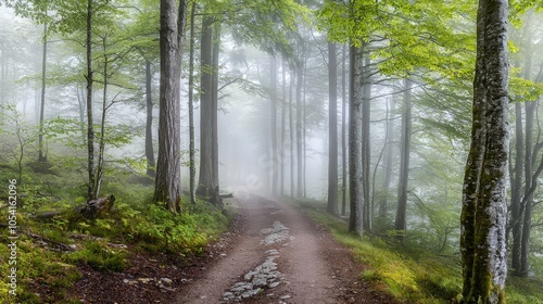 © sobartea, Fototapeta premium A winding dirt path leads through a misty forest, sunlight filtering through the trees.